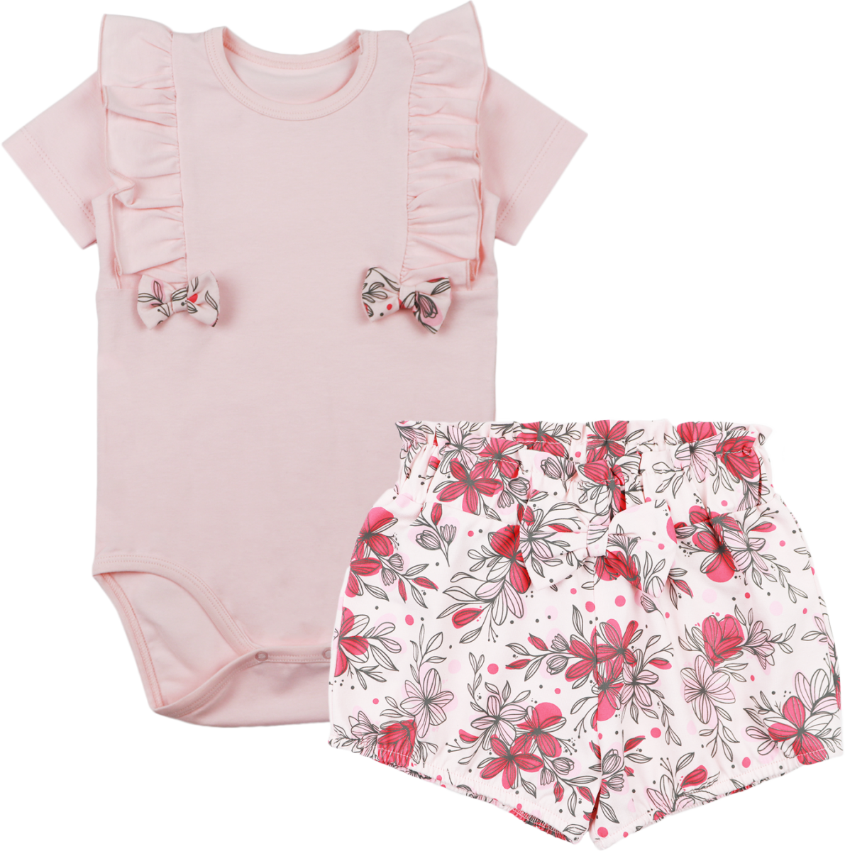 De bodysuit en shorts met bloemenprint zijn gemaakt van fijn en zacht katoen, gecertificeerd met OEKO-TEX Standard 100. Met het warme weer is het tijd voor veel buitenspellen, nieuwe vrienden en avonturen. Met deze set zullen de kleintjes zich op hun gemak voelen in hun spelletjes. Je kunt je in een set kleden voor een speciale gelegenheid of in het dagelijks leven. Makkelijk te combineren met andere kleding uit de kledingkast van de kleine.